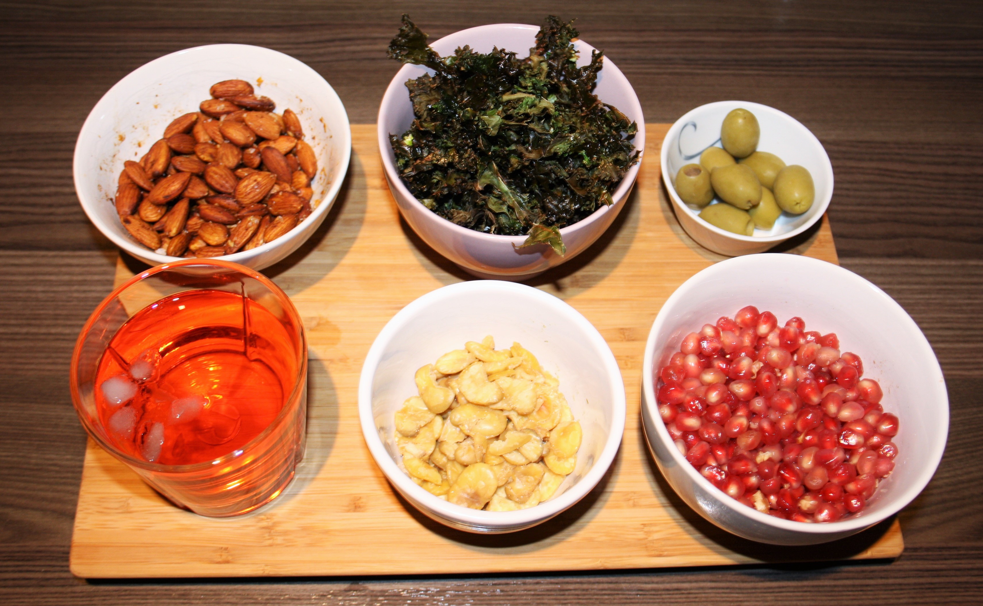 Jeg serverte spanske mandler (ristet med krydder), grønnkålchips, oliven, bondebønner og granateple til, en perfekt start på en trivelig aften!