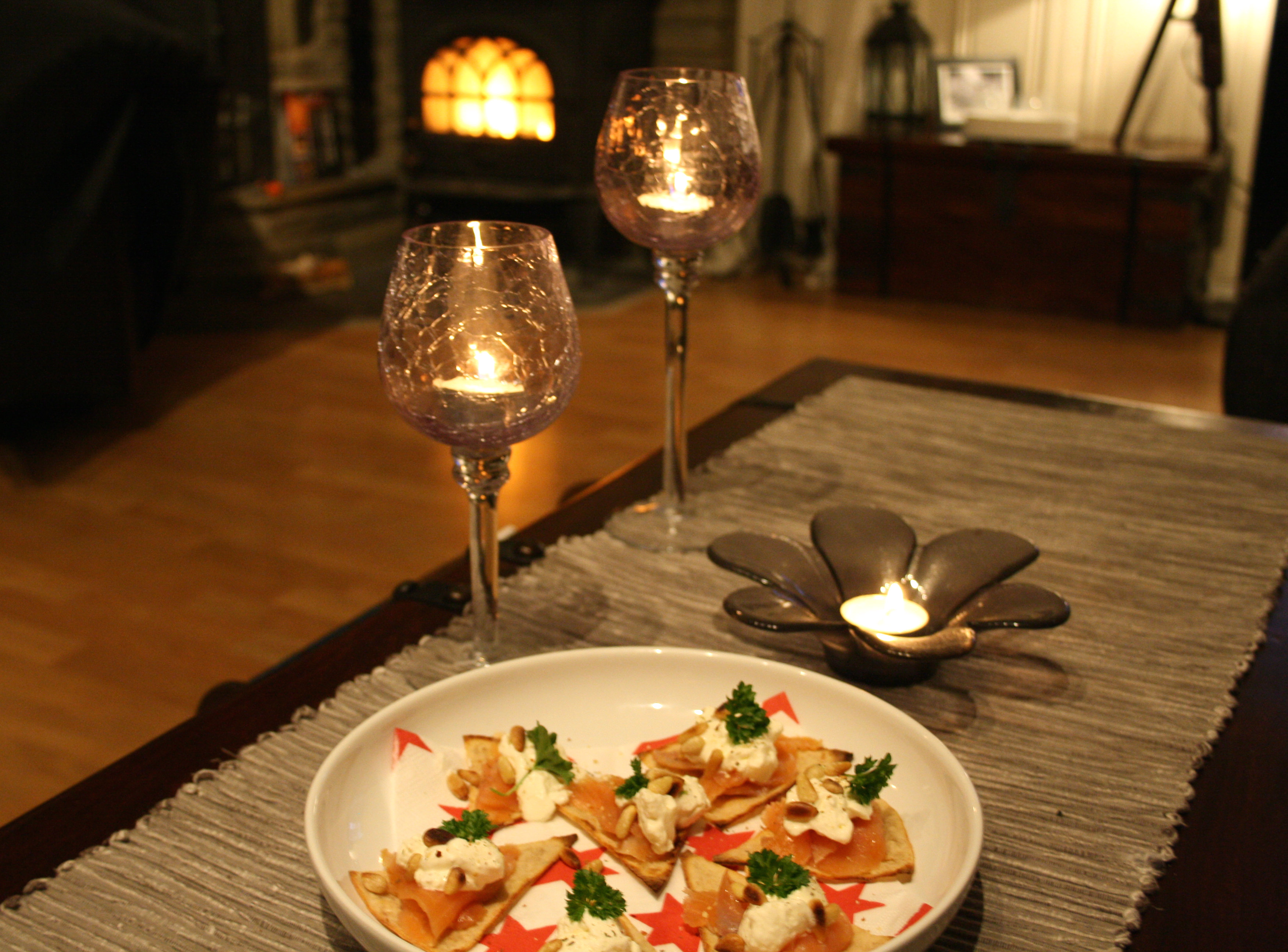 Hva med speltlomper med røkelaks, sitronrømmekrem og pinjekjerner til champagnen?