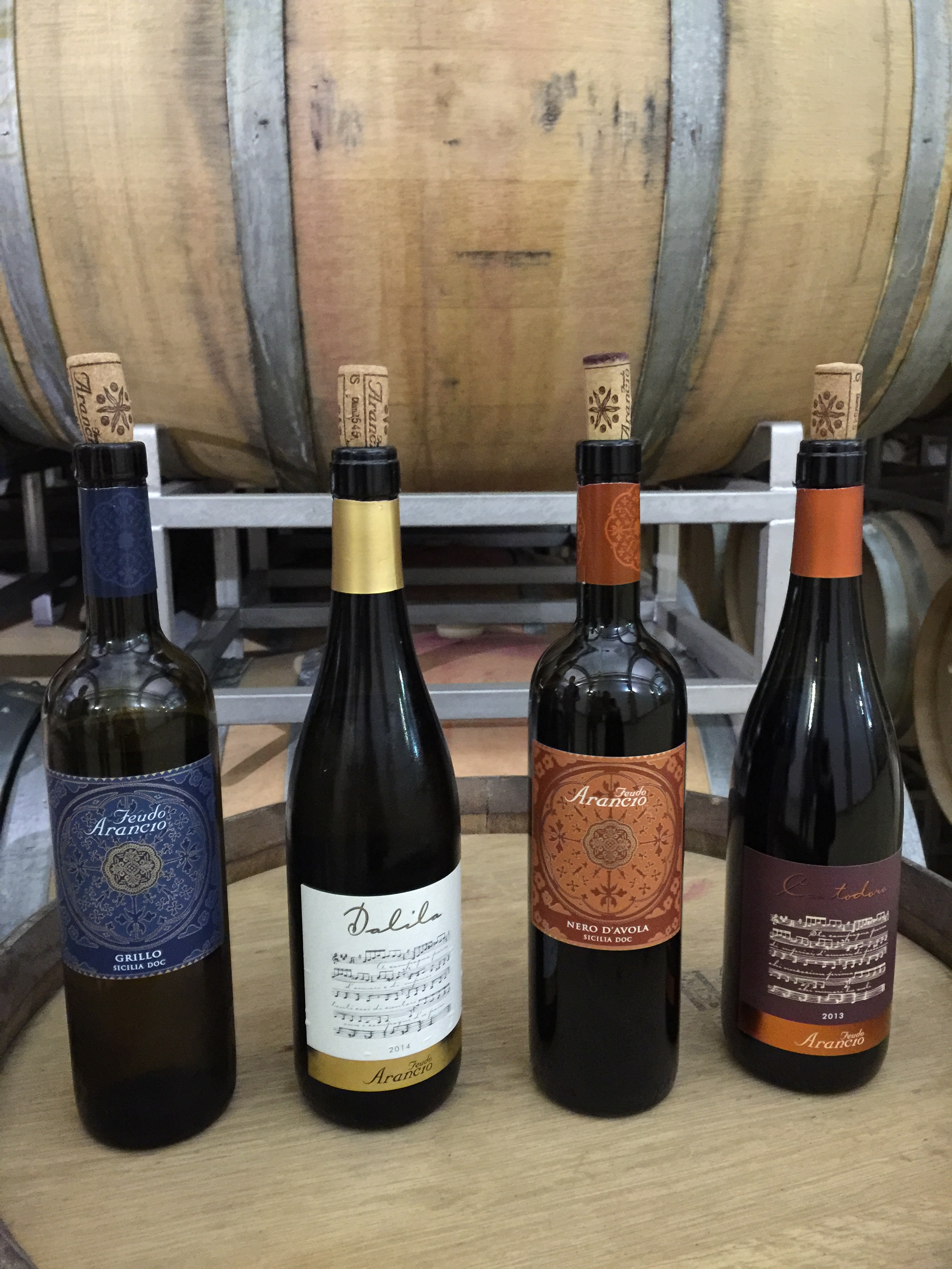 Feudo Arancio, Arancio betyr for øvrig appelsin og gården heter det på grunn av at det tidligere ble produsert appelsin her, ligger helt nydelig til, 200 hektar fantastisk vinmark! Vi tar en liten gåtur og ser på plantene, de har både internasjonale druer som Chardonnay og lokaldruer som Grillo og Nero d`Avola. De produserer ca. 2 millioner flasker i året og hovedmålet deres er å produsere unike Sicilianske viner som er drikkevennlige nå, med fokus på gamle vintradisjoner sett med nye og unge øyne samt moderne teknologi.