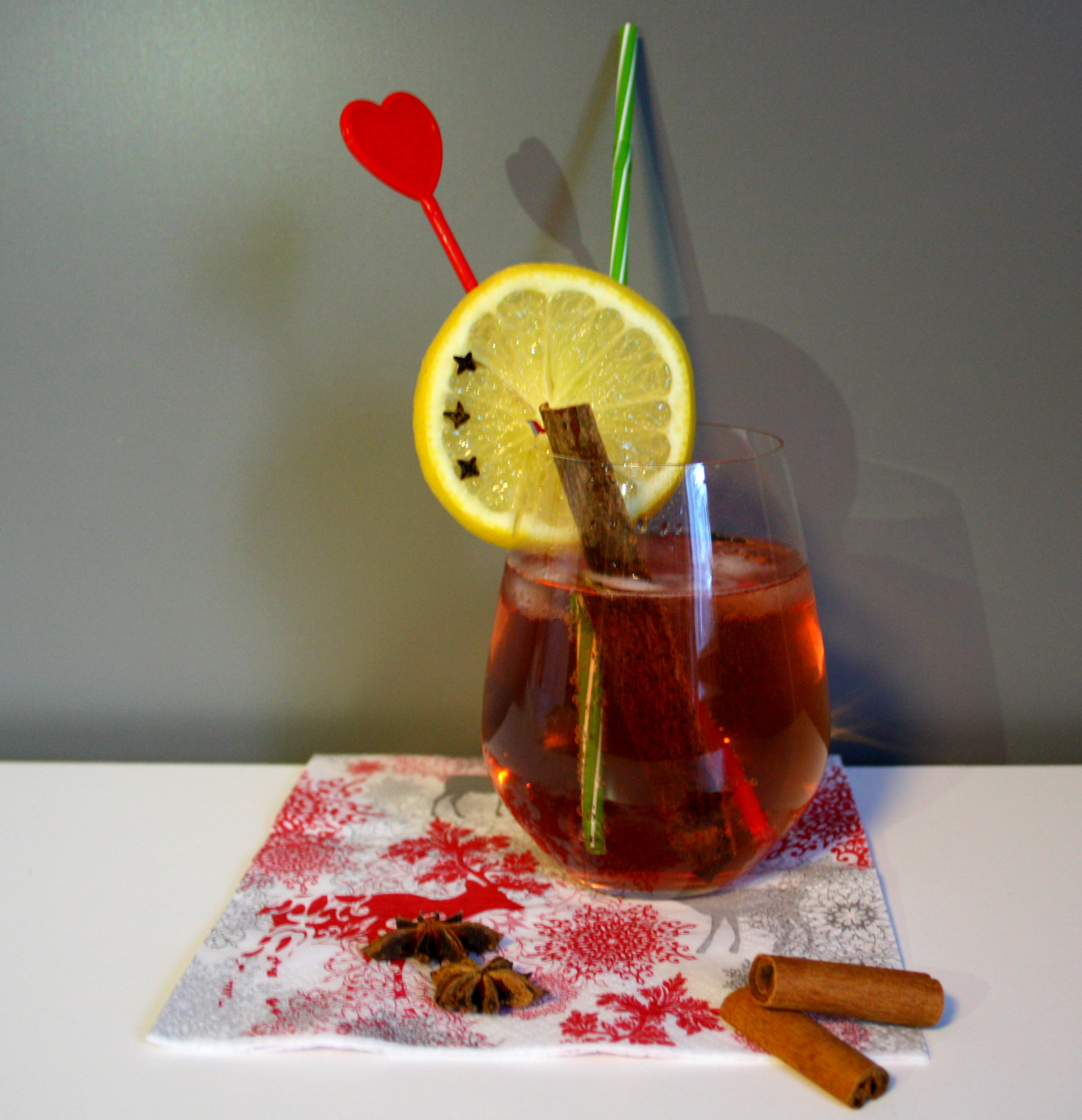 Så har du oppi litt tranebærjuice til ønsket rødfarge, stikker nelliker i sitronen på glasset, har i en kanelstang som rørepinne, finner rød pynt og grønt sugerør. Voila!