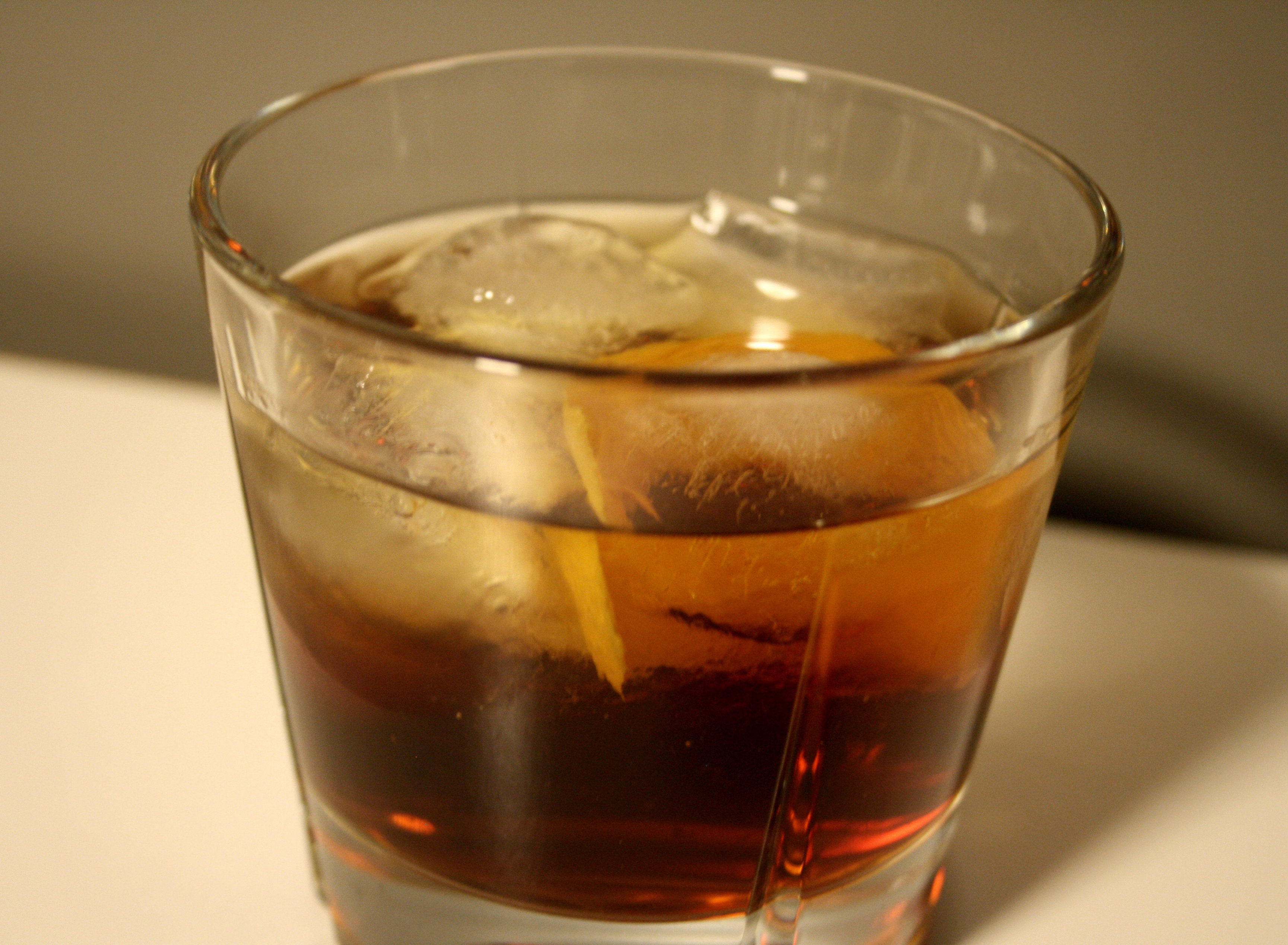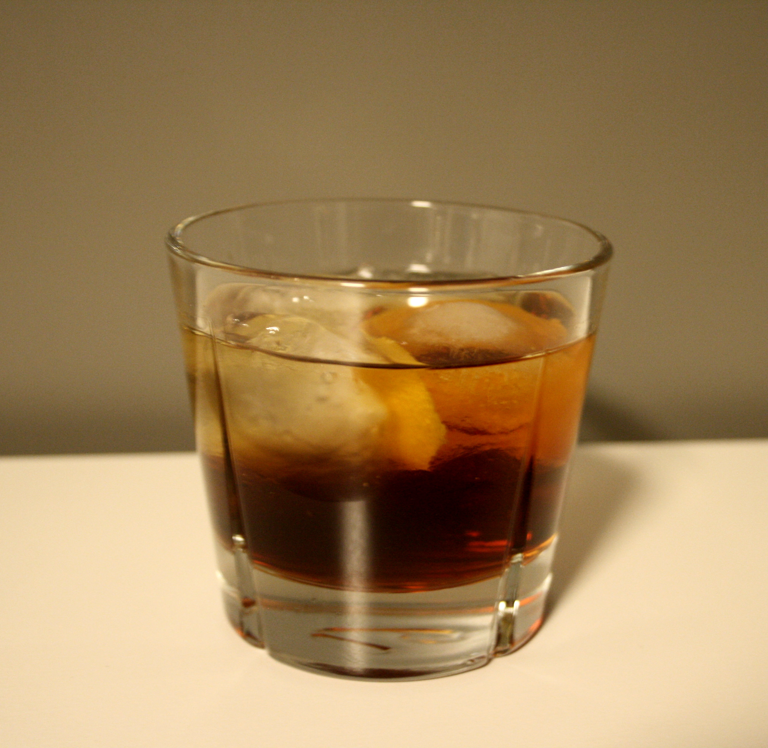 Fyll et glass med isbiter, hell over brennevinet, rør (eller ikke) og pynt med et appelsinskall.