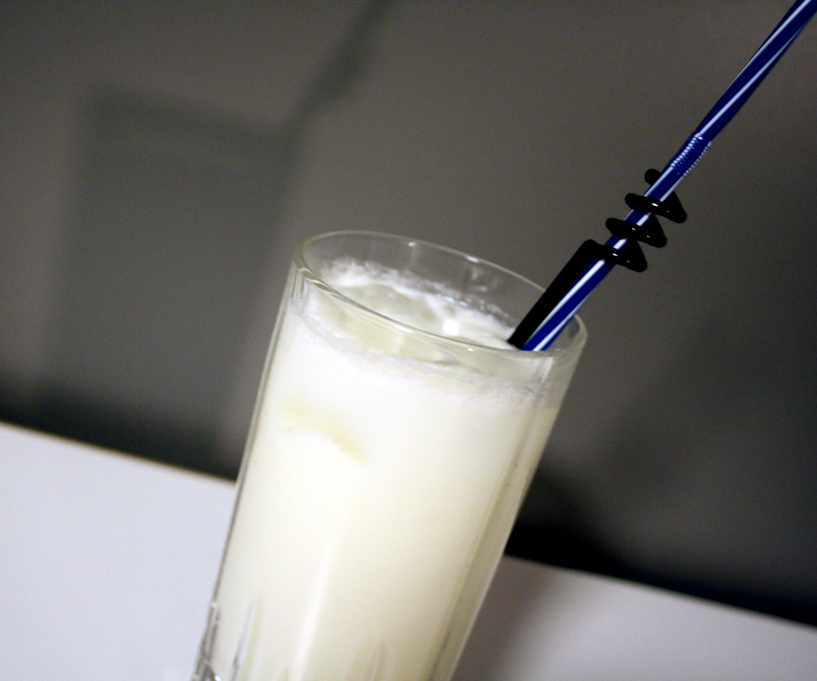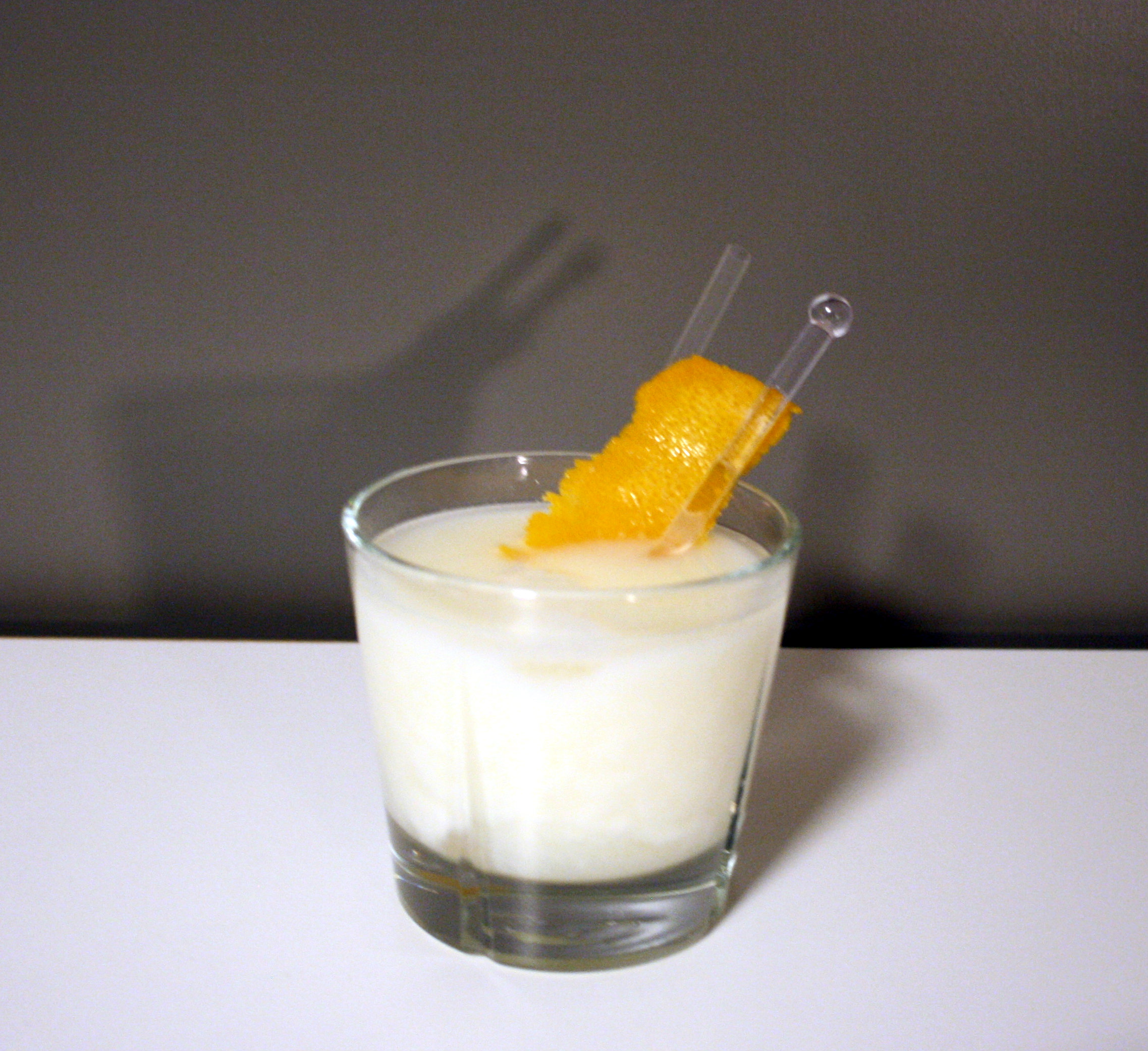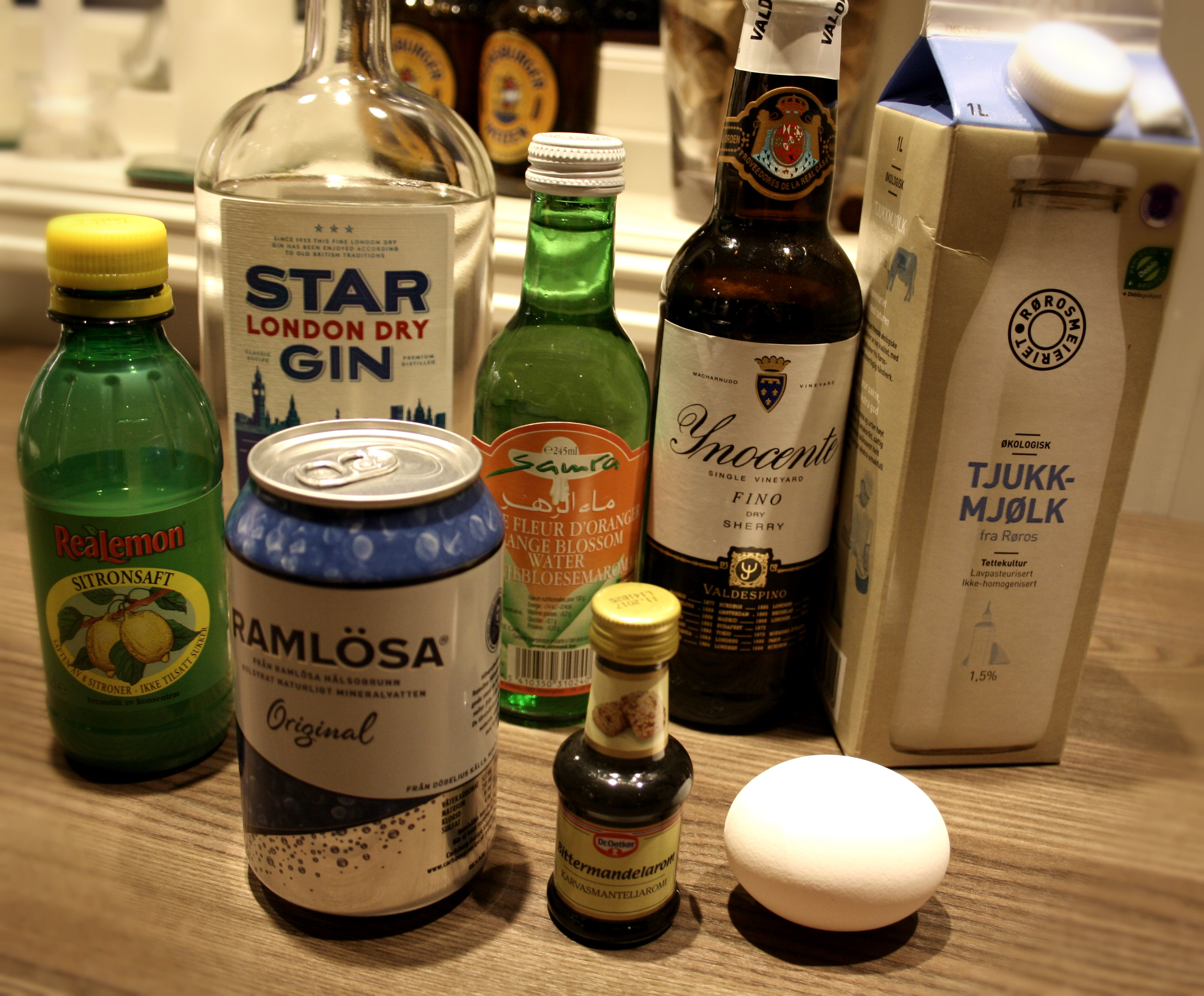 Rør gin, sherry, tjukkmjølk, sitronjuice og sukkerlake forsiktig, smak til med appelsinblomstvann og mandeldråper og hell over et glass med isbiter. Topp med «Fizz».