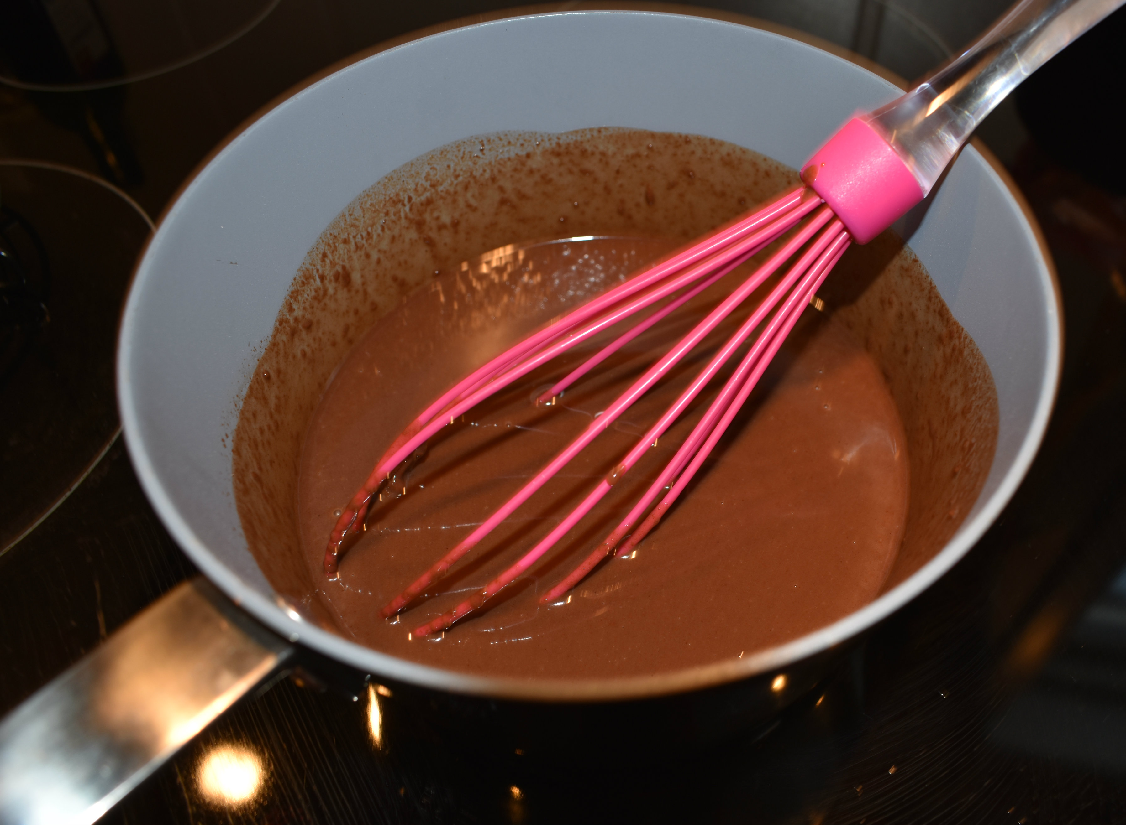Du smelter sjokoladepålegget på lav varme med fløten i en kjele. Så lar du det kjøle seg litt før du blander det med vodka.