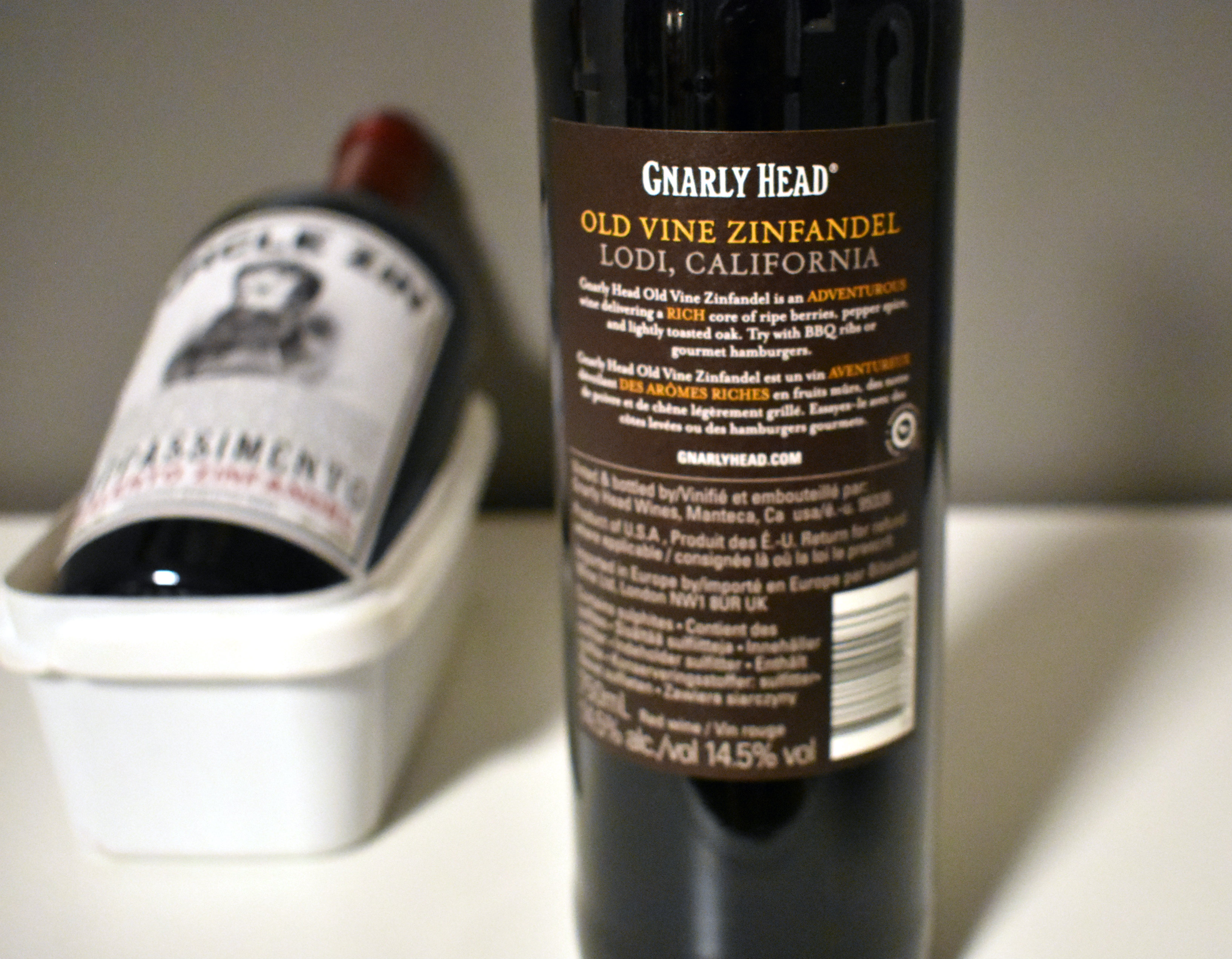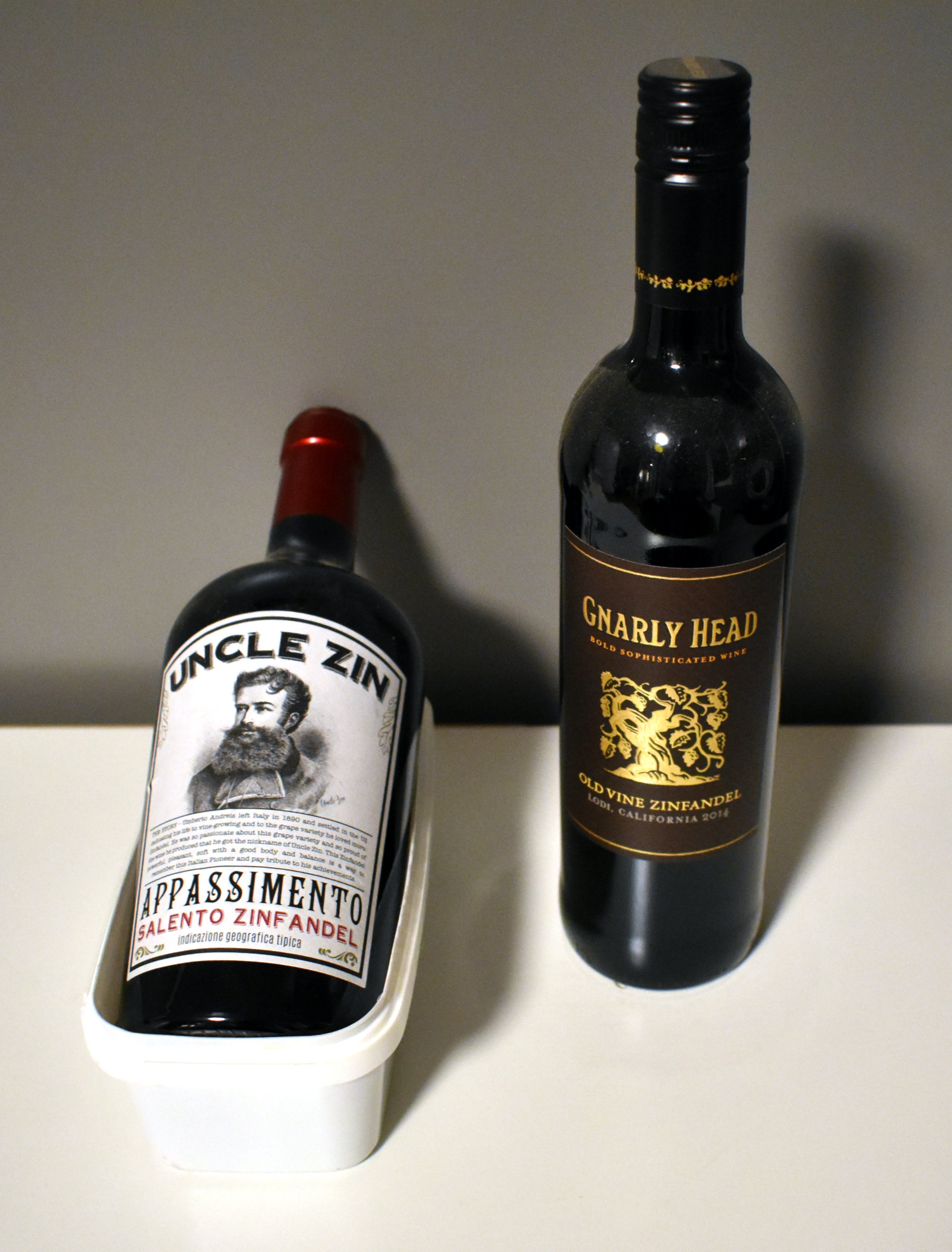 En kald lørdagskveld tidligere i vinter fant vi ut at vi hadde lyst på zinfandel; god, varmende Amerikansk zinfandel. Jeg spratt ned i kjelleren og plukket med meg disse to, en Italiensk og en Amerikansk:
