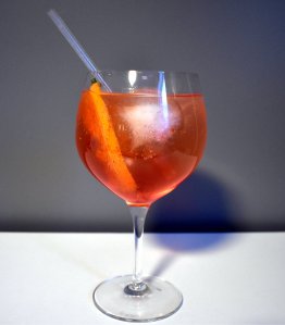 Hell 4 cl gin og 2 cl campari over en stor isbit (eller flere små) og topp med en del tonic og tre deler prosecco. Forfriskende!