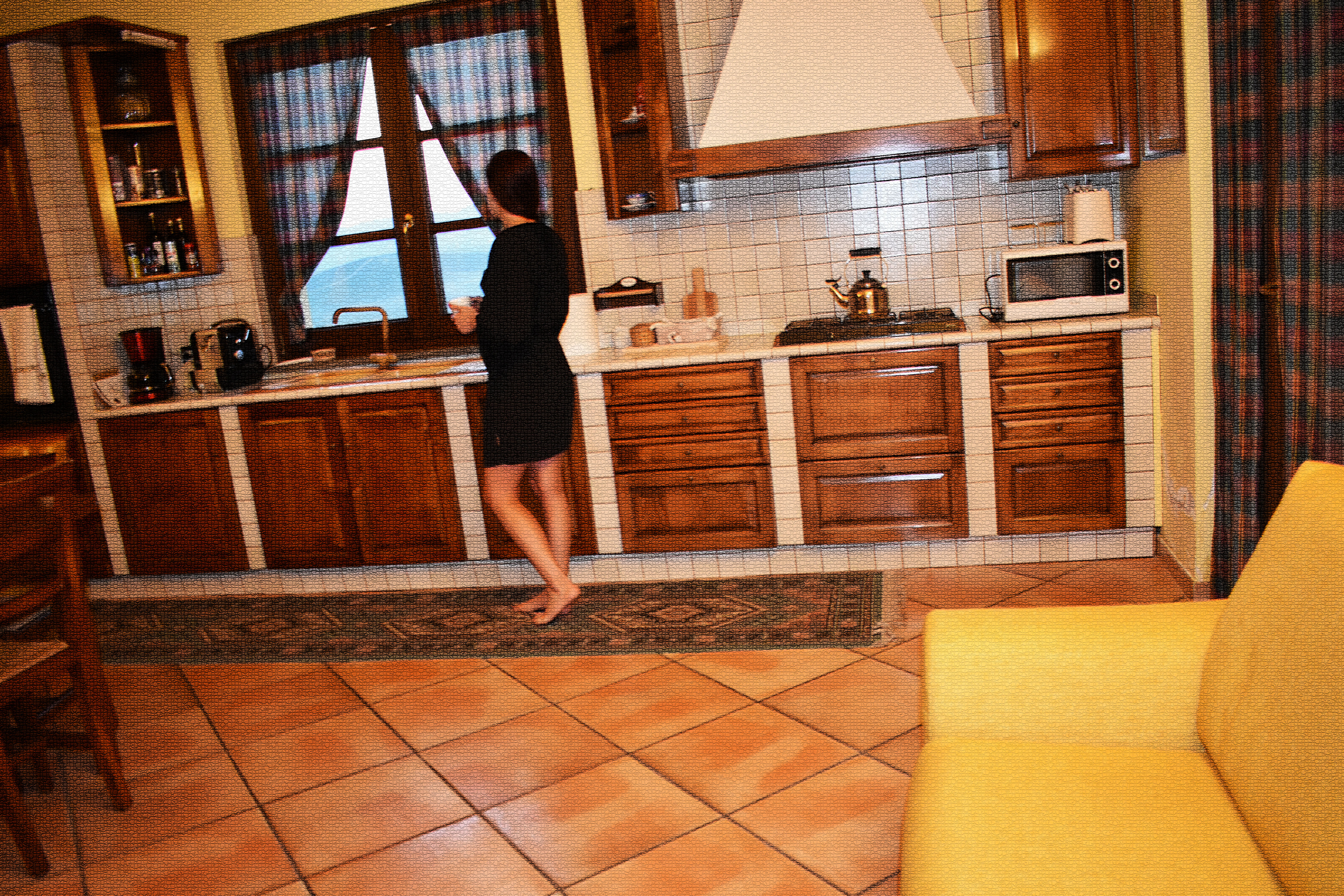 Det var så hyggelig å våkne til soloppgangen og kaffe om morgenen i Villaen, utsikten var på sitt aller beste og jeg nøt flere kopper kaffe før jeg fikk på meg joggeskoene! Legg merke til stilen på kjøkkenet (her har jeg spritet opp bildet med mosaikkfilter), skikkelig romantisk landstil.