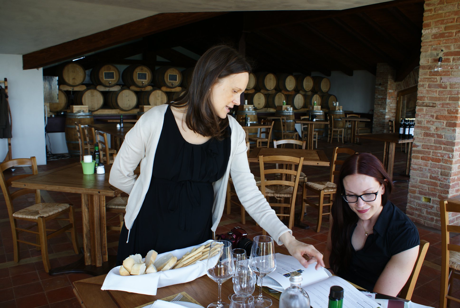 I april var jeg på et utrolig hyggelig besøk hos et vinhus i La Morra, nemlig Agricola Marrone! Jeg har smakt og skrevet om noen av vinene deres før og det var moro å besøke de og smake mer sammen med de, ikke minst fikk jeg servert en deilig lunsj til! Man leser jo gjerne at vinhusene er familiedrevne osv. Det kunne man lett se at stemte her, jeg smakte vin med den ene datteren i huset, Serena, spiste lunsjen moren hennes hadde lagd og svigersønnen var vertskap for en annen besøkende gruppe i samme lokale.