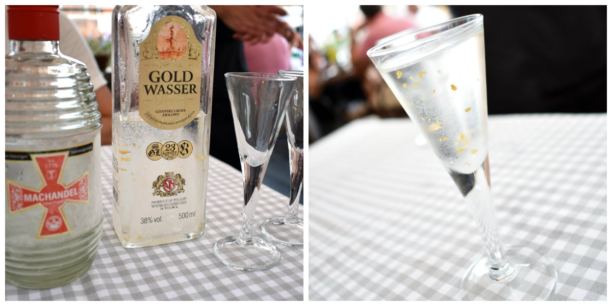 Dessert var vi for mette til å spise, vi er forrettfolk, ikke dessertfolk. Men en god «sterk en» etter maten tar vi gjerne. Anbefalingen var den lokale drikken Danzig Machandel (som serveres med en sviske og en tannpirker som skal kenkkes i to) og selvfølgelig Goldwasser med ekte gull. Dette regnes som de to nasjonaldrikkene her.