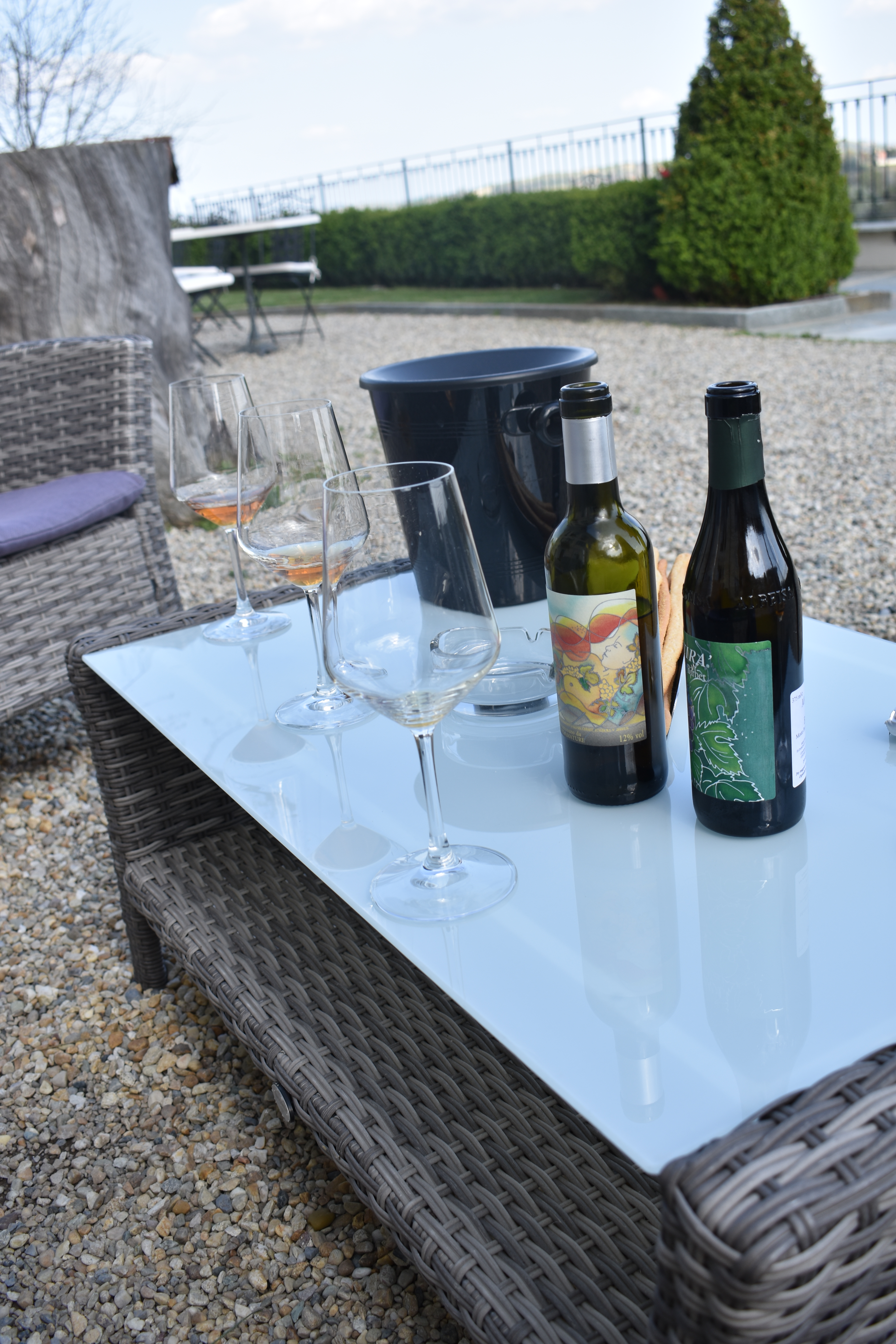 Jeg får servert et glass hvitvin ute i hotellets hage mens Giacomo forteller om vinhuset, og selv om det frister å bli sittende med vinglasset å nyte solen og utsikten så er tid for å se på det aller helligste: vinkjelleren.