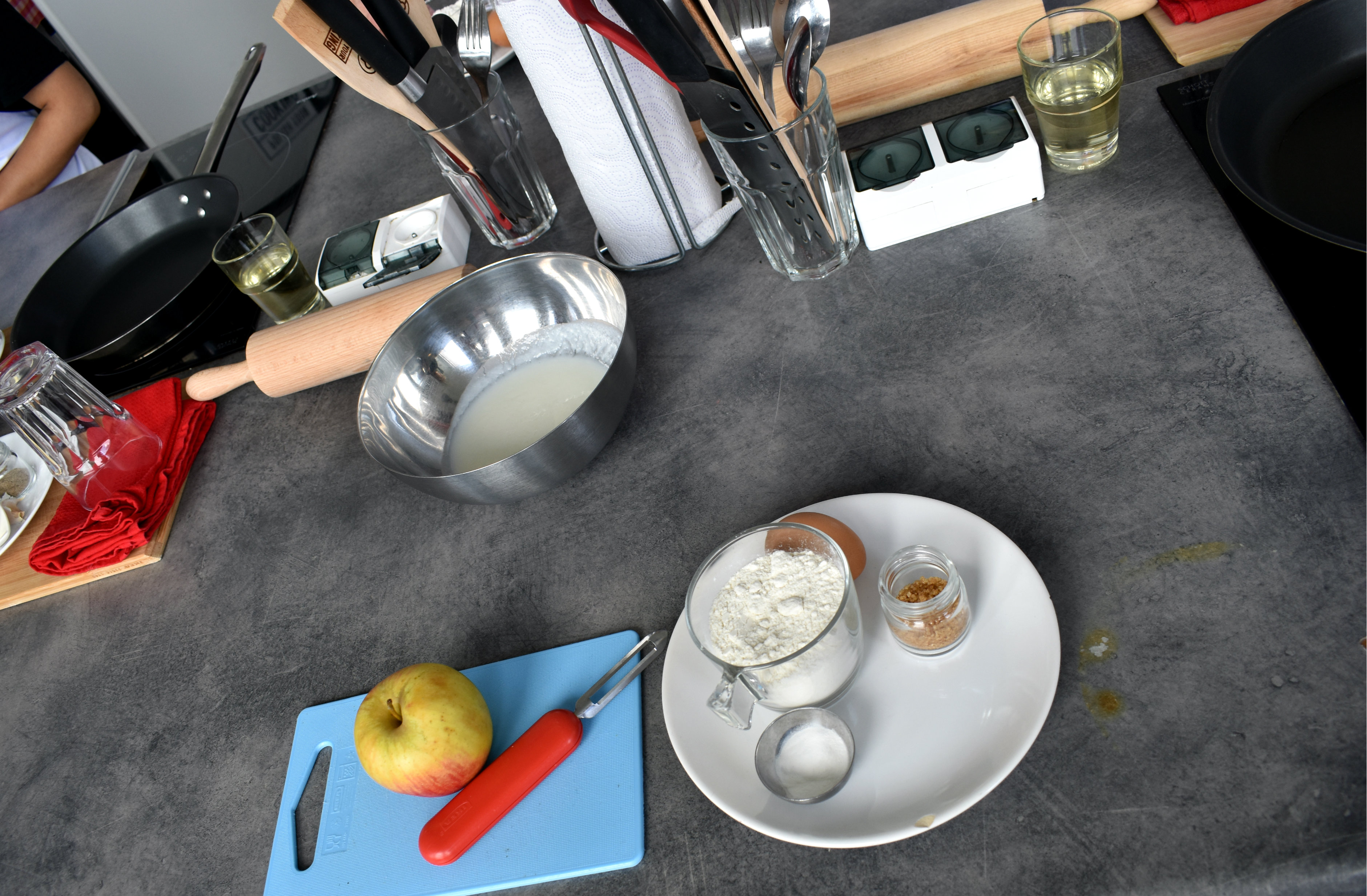 Så ble vi satt i arbeid, vi tre norske, noen amerikanere, en fra Canada og en fra Kina samt et par fra Tyskland. Vi skulle lage eplepannekaker! 7-åringen vår syns dette var et utrolig bra valg, da han elsker pannekaker. Det virket som om alle koste seg under kyndig hjelp fra kokken, både store og små!