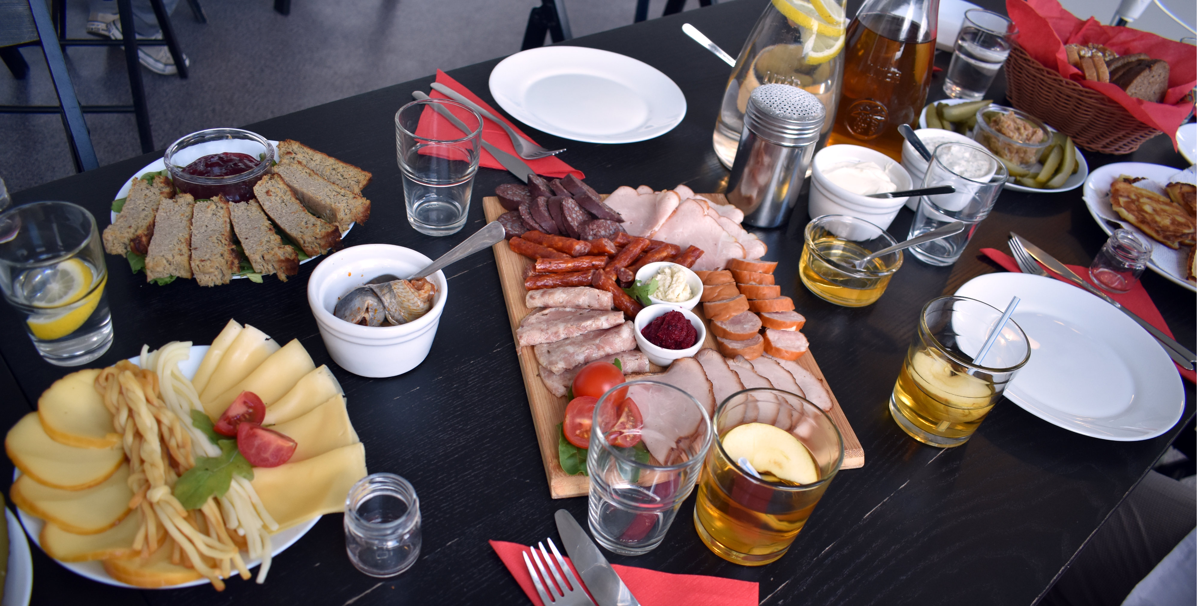Når vi er ferdige med pannekakene blir vi møtt av dekket frokostbord, masse godsaker som ulike pølser, oster, pateer, brød, sild osv. Pannekakene vi har lagd blir dessert, anbefalt med en polsk eplecider til!