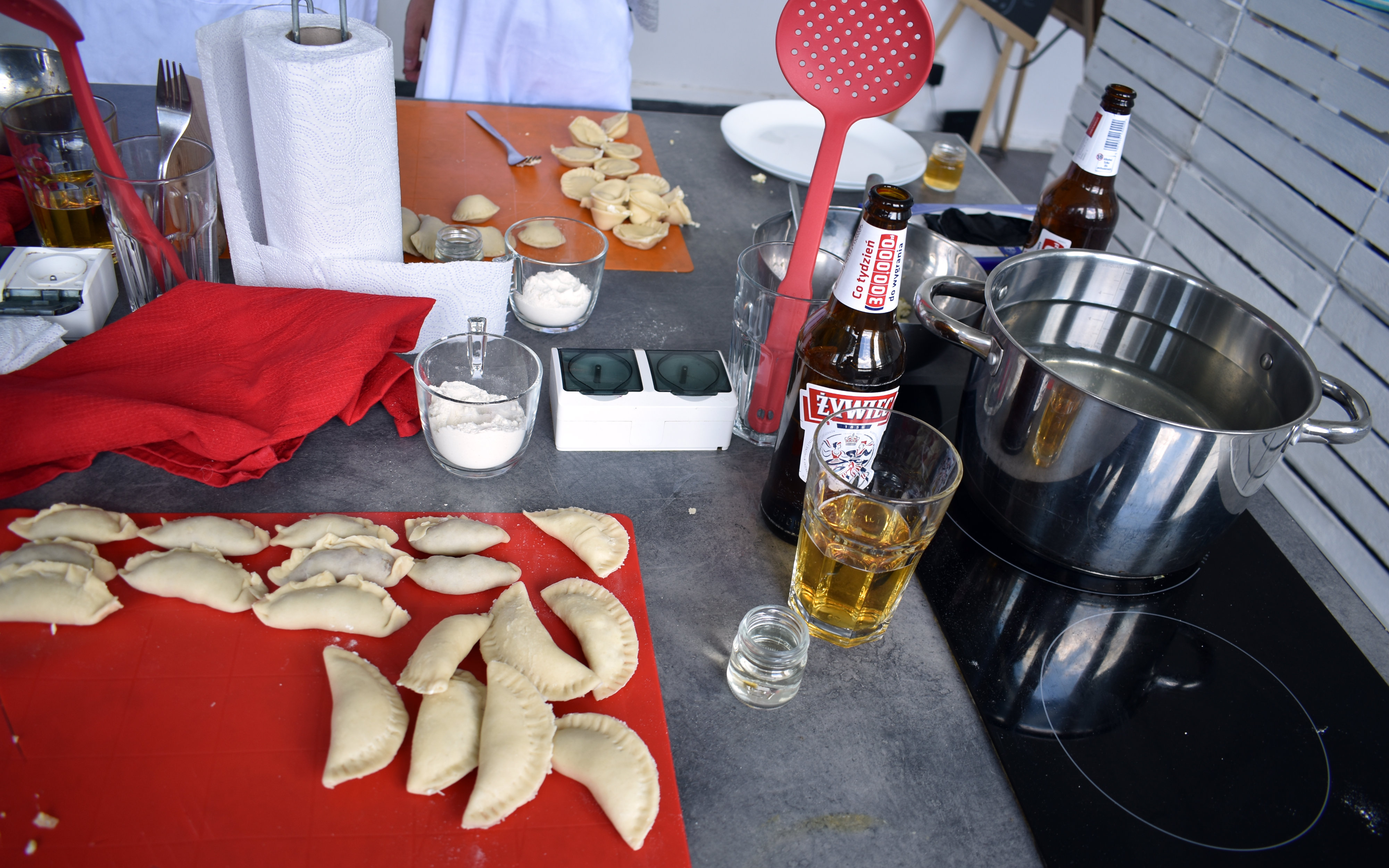 Så skal vi lage pirogi, en spennende polsk matrett! Det er en deig man fyller med ulike ingredienser, for eksempel ost, kjøtt, løk osv. En premiere på matrett for samtlige. Men først, en vodka shot (dette er frivillig, ikke noe drikkepress, kun en morsom polsk tvist på kurset).