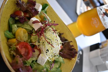 Sulten og tørst etter en lang reise gikk jeg i hotellets restaurant å kjøpte meg lunsj før vi skulle møtes i lobbyen, her hadde de til min store glede både god mat på menyen og craftbeer anbefalt til! Det ble en salat med ost på meg, med en deilig IPA til.