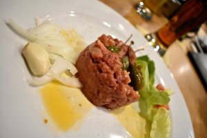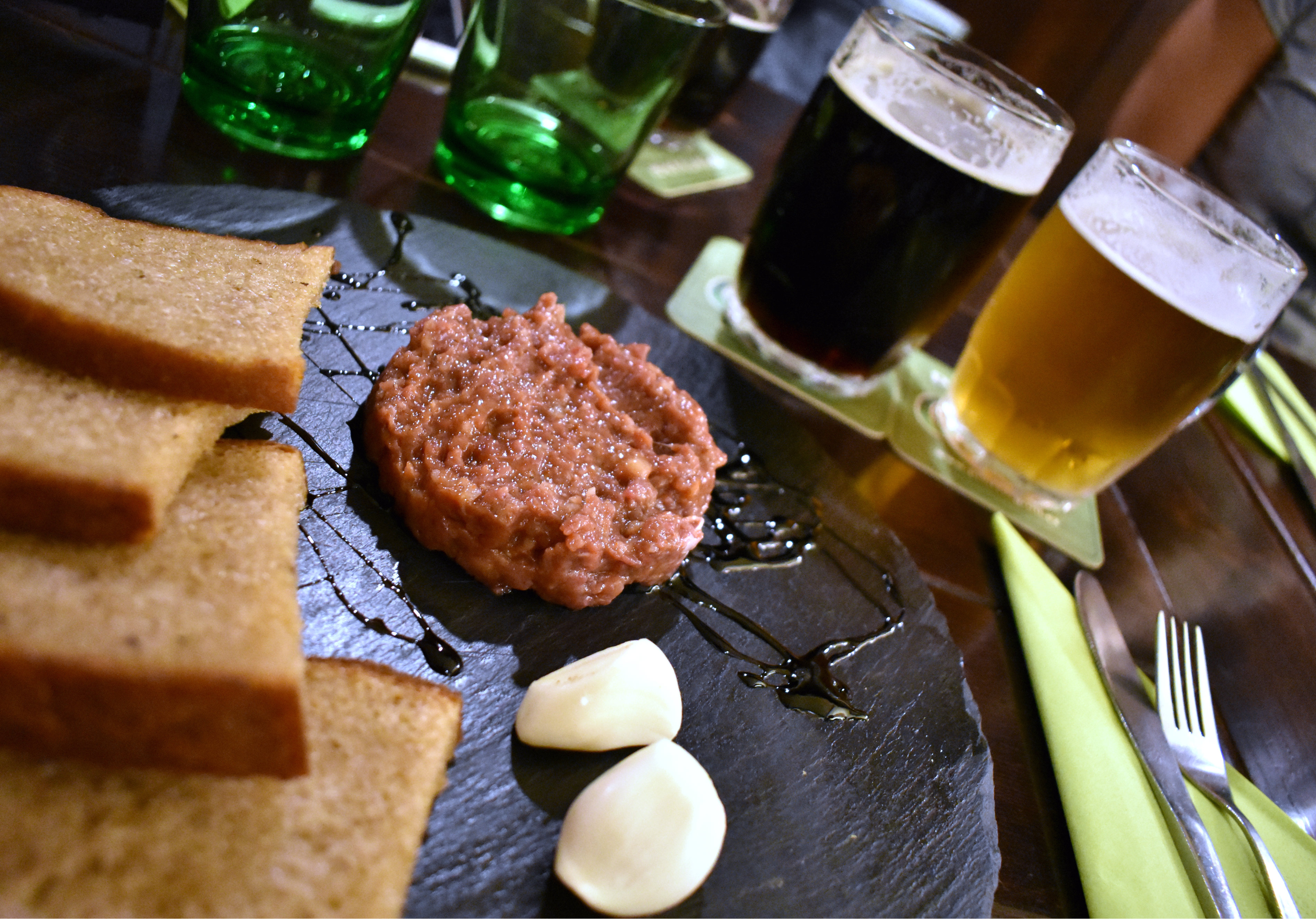 Matmenyen er rustikk og innbydende, alt fra andelever og tartar (bilde), til ølsupper, ostetallerkner, biffer, kalv, fjærkre og «ølsnacks» som grillet camembert. En imponerende meny.