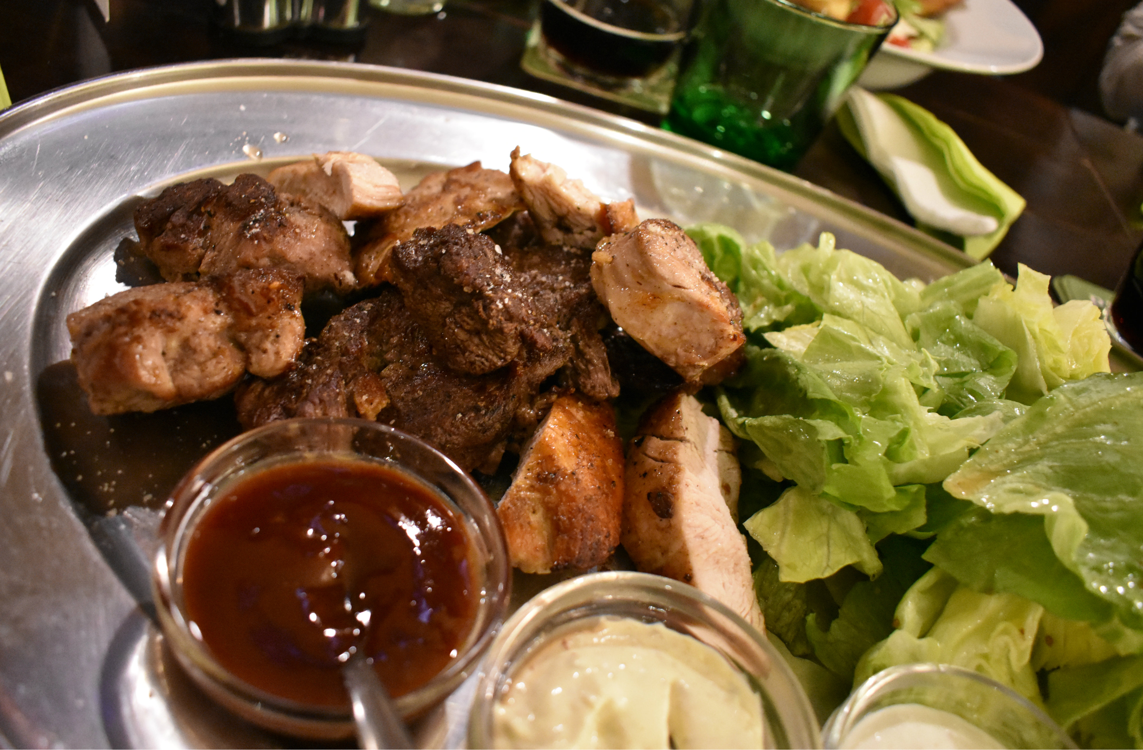 Til hovedrett ble det en tallerken forskjellig grillkjøtt, det var meget godt! Restauranten hadde en rustikk og fin sjarme, godt øl og god mat, vi krysser fingrene for at de beholder det etter oppussing!