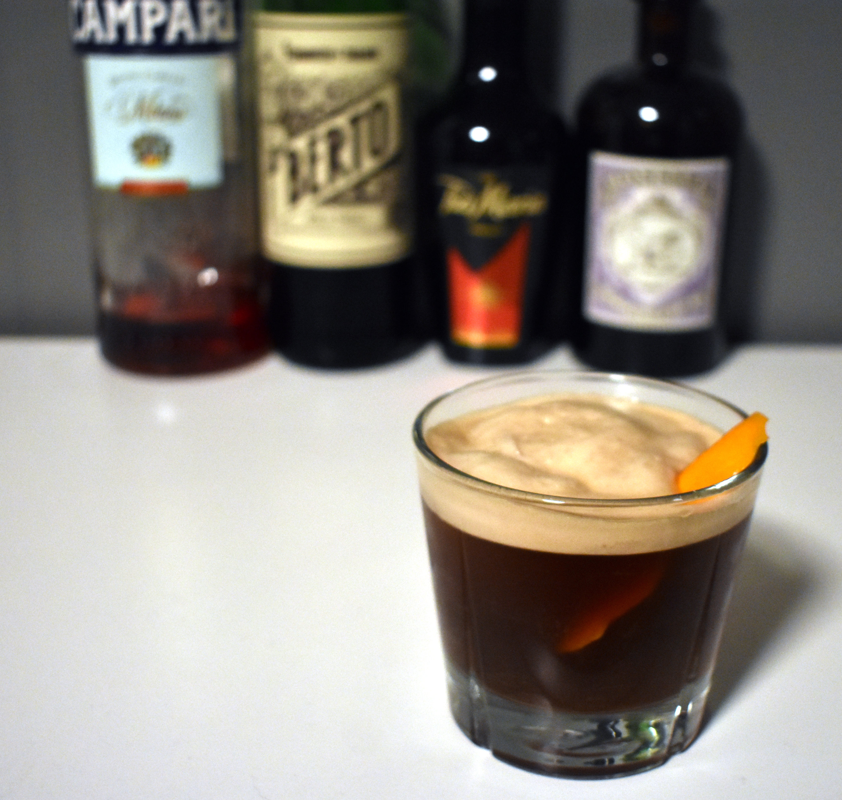 Her har jeg brukt like deler gin, campari, og rød vermouth som vanlig, 4 cl per cocktail. Så tilsatt 2 cl tia maria og 2 cl kaffe. Alt er ristet på is før det er helt over en stor isbit. Jeg har så gitt det hele en appelsintvist på toppen.