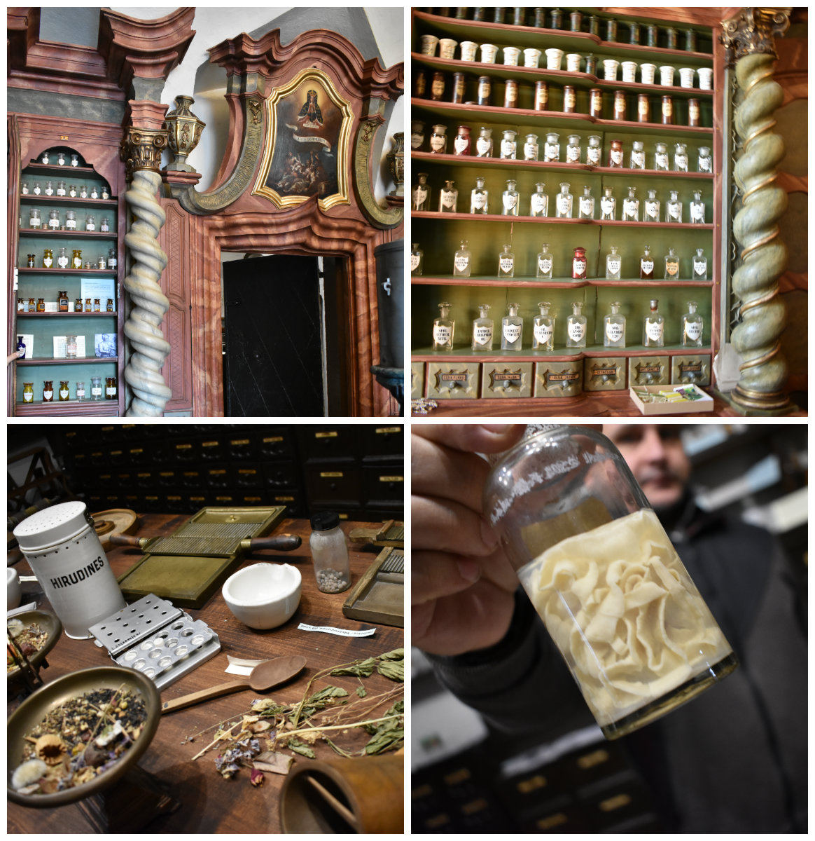 Å gå inn her er som å gå inn i et eventyr, med små krukker og glass, mystisk utstyr, og ikke minst hornet av en enhjørning i taket. (tannen av en hval) Bakrommet ble brukt til å lage medisin, og dette er bevart i dag. Her ser man hvordan medisin ble lagd for flere hundre år siden. Mannen som driver det tar deg gjerne med på en rundtur og viser frem alt fra utstyr til å tappe blod, igler, levende ormer og mortere til esker med cyanid og andre lumske saker.