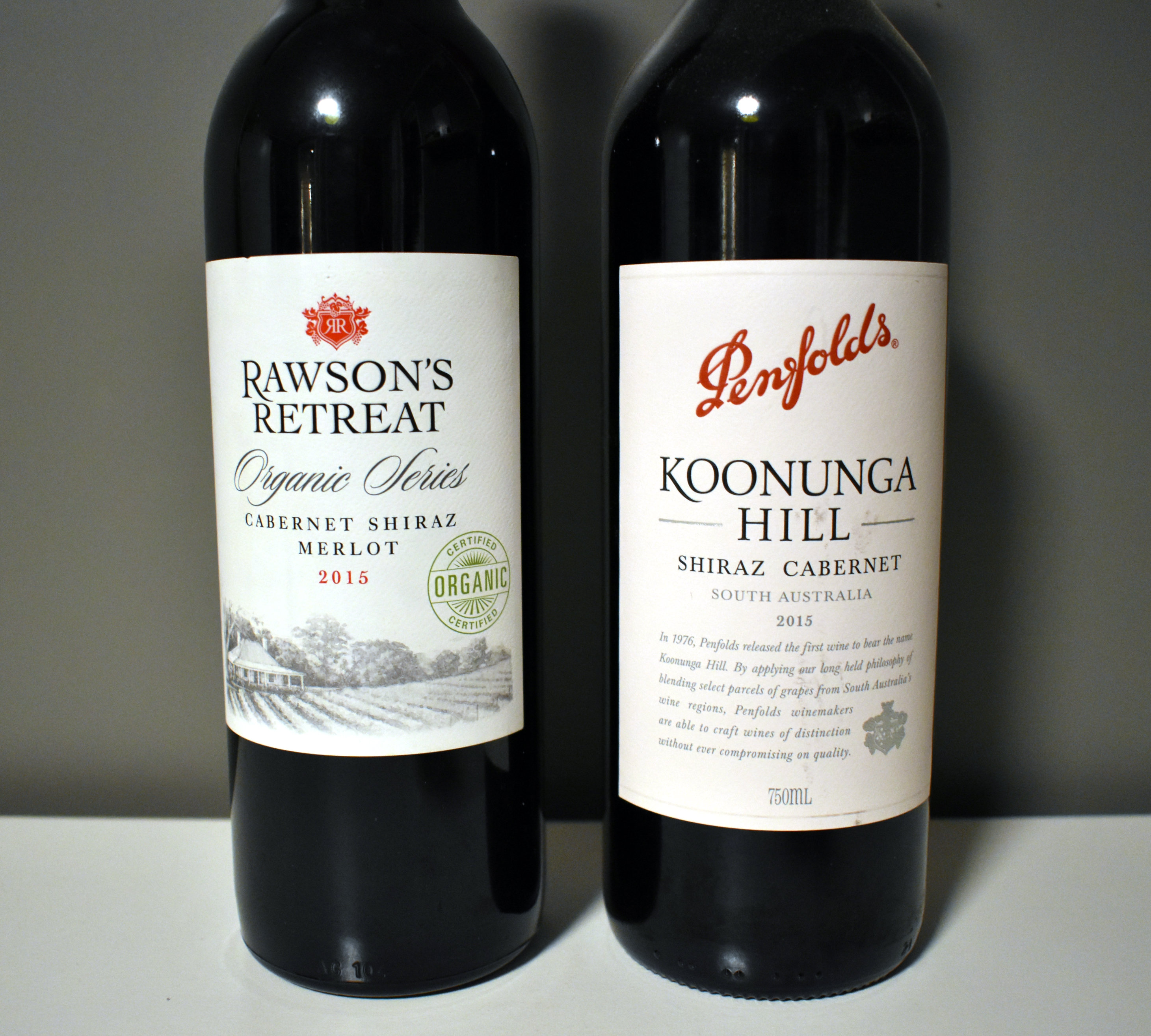I dag tar vi en liten duell mellom Penfolds Koonunga Hill Shiraz Cabernet Sauvignon 2015 og Rawson’s Retreat Cabernet Shiraz Merlot 2016. Det blir ikke en rivende duell mellom to vidt forskjellige produsenter da det er Penfolds som produserer Rawson`s, men en liten indikasjon på hvilken du kanskje bør kjøpe.
