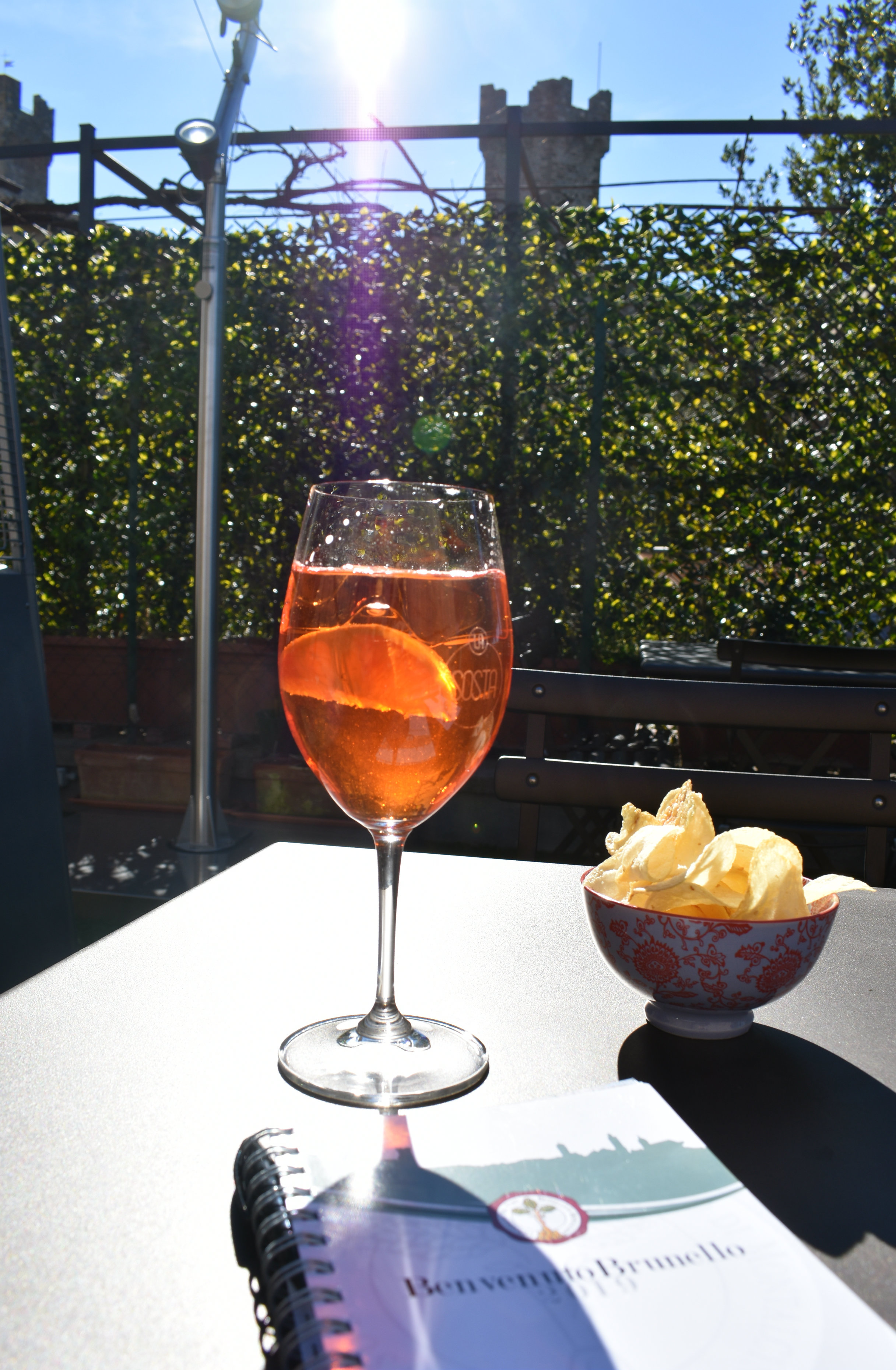 Hvis man vil ta en pause i all den deilige rødvinsdrikkingen har de også den populære drinken Spritz over alt, allerede i februar er det deilig å sitte ute i solen som jeg gjorde, og bla gjennom dagens program med en drink. I bakgrunnen ser du fortet.