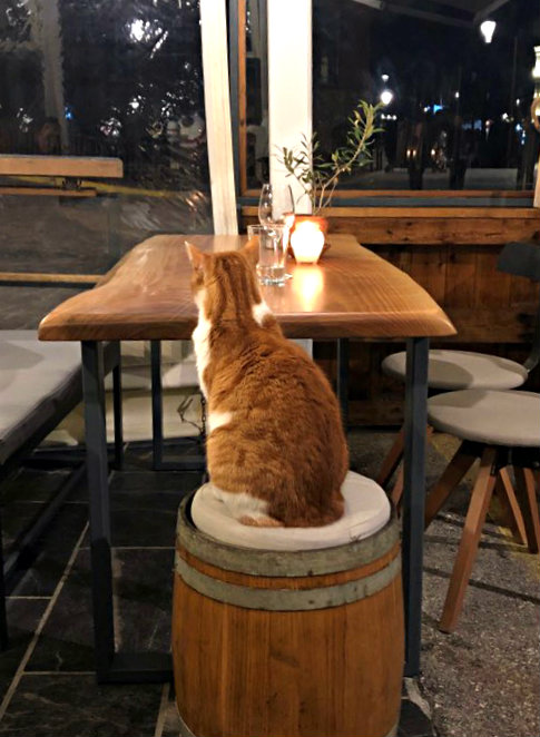 Mens jeg ventet kom denne søte katten og slo seg til på nabobordet, den vennlige kelneren forklarte at det var bordet til katten. Og selv om det kom noen amerikanske turister og slo seg ned fortsatte han å sitte der til deres fornøyelse!