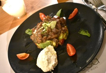 Tunfisk med avokado og lime/yoghurt krem, helt nydelig. Jeg fikk også deilig nybakt brød med ulike tapenader på siden. Vinen jeg fikk til, en Assyrtiko med fantastisk friskhet og syre passet utmerket til.
