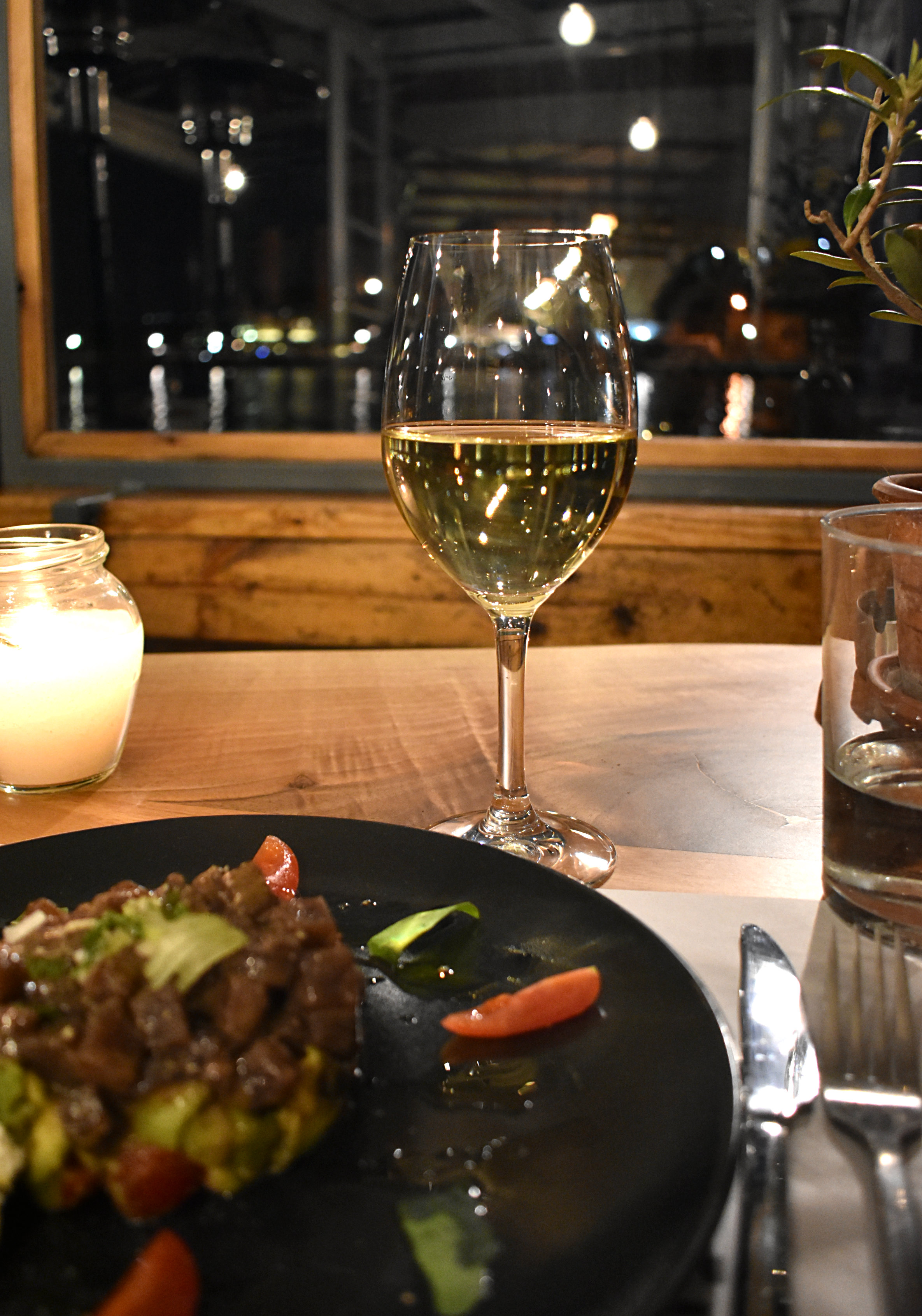 De hadde masse deilig mat å velge mellom, både sjømat og alt annet. Vinlisten var også imponerende, skikkelig vinbar-stil! Jeg bestilte en tunfisktartar med en anbefalt hvitvin til.
