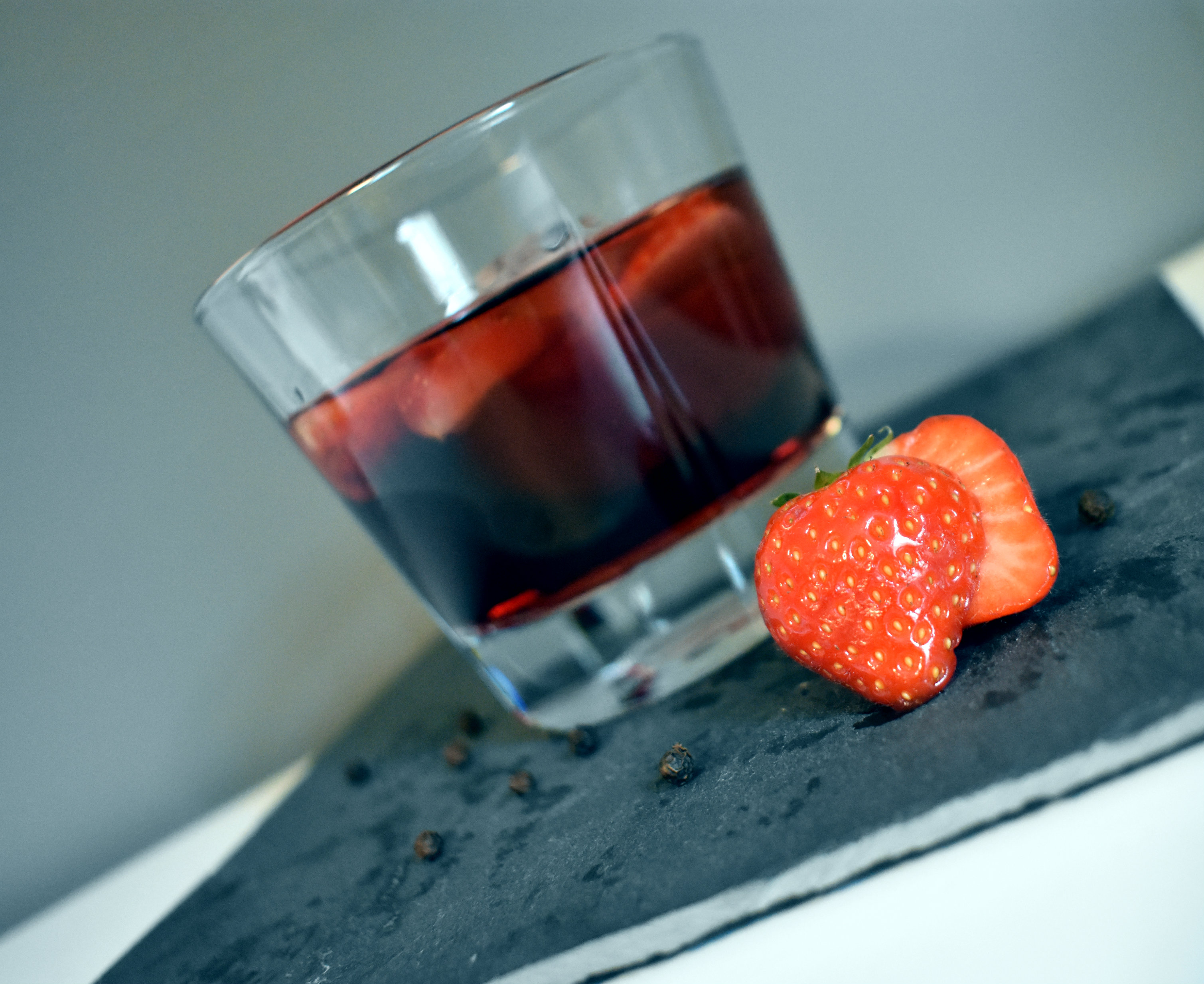 Å soake gin er egentlig ganske interessant, det er morsomt å bruke i ulike cocktails! Her har jeg latt jordbær (i skiver) og røstede pepperkorn ligge med gin en dag før drikking…
