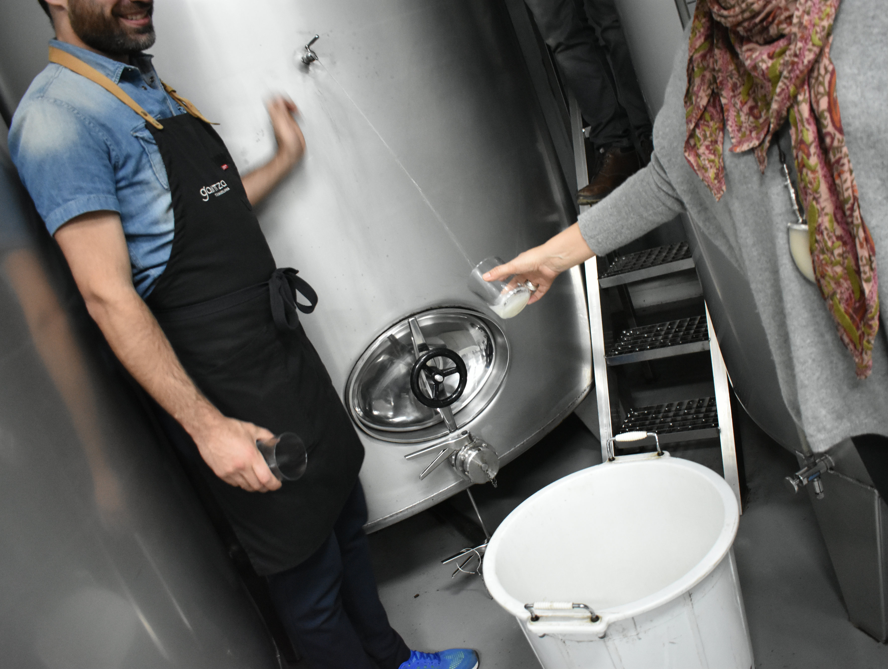 Tradisjon tro får jeg smake vinene deres rett fra tanken, her sprutes vin i kopper som en sosial sammenkomst rundt ståltankene. Både lokale og turister tar turen innom på lunsj og drikking i kjelleren.
