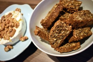 Brie, skjært i, og lunt i ovnen til den ble myk.