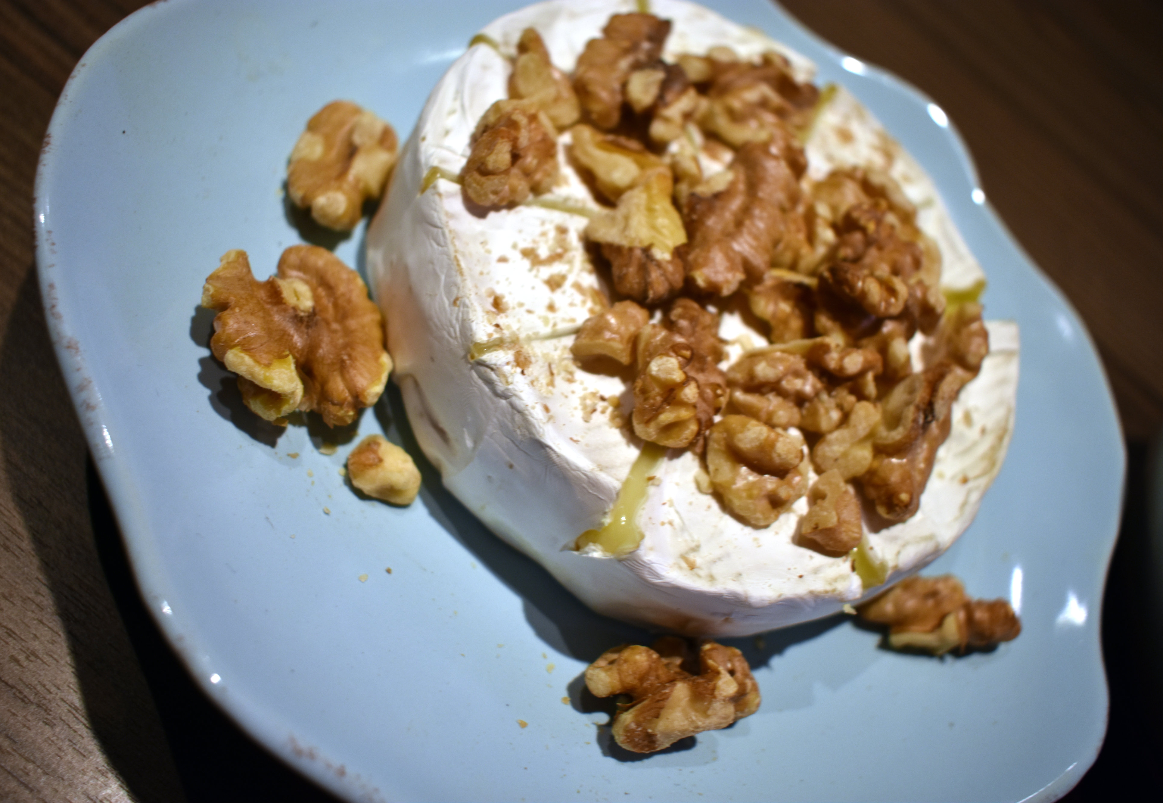 Brie, skjært i, og lunt i ovnen til den ble myk.