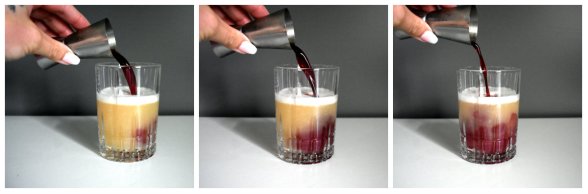 Tørrist alle ingrediensene utenom vinen, så rister du med is og heller over i glass. Ha rødvinen i til slutt som en float. Overraskende godt!