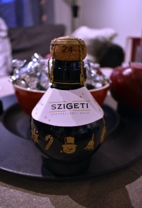 Szigeti Brut Sekt pleier å pynte seg til både jul og påske, så det er nok ikke lenge før den dukker opp i gul drakt om den er like tidlig ute som påskemarsipanen.