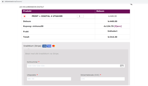 Husk at du får 30% avslag på abonnement med koden Vinhona30, dette må du fylle inn etter at du har trykt på «betal med kort» og fylt inn navn og adresse.