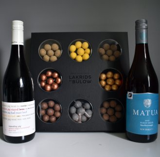 En liten duell mellom to flotte Pinot Noir fra New Zealand og Selection Box fra Bülow! Anbefales! (Det trenger selvfølgelig ikke være akkurat dette merket av lakriskuler, men det er de jeg bruker å gå for. Dessverre for lommeboka, men de har så mange deilige smaker.) Kan for øvrig anbefale Black Box (“Christmas” og “Snowball”) også, butter cookie er himmelsk!