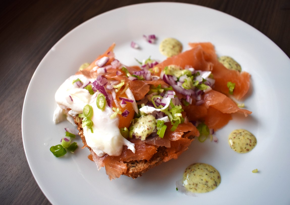 Sandwich med røkelaks, rødløk, dijon vinagrette, vårløk og posjert egg. Nydelig.