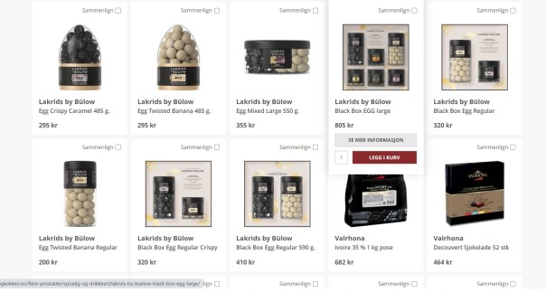 Kategorien Spiselig og Drikkbart hos Bakeren og Kokken er skummel, her er det masse godsaker… i tillegg til litt forskjellig gourmetsalt (anbefaler dette rødvinssaltet) og krydder har de også en del kaloritette søtsaker som er fine til påske. I år har jeg valgt meg ut to favorittmerker: Valrhona og Lakrids by Bülow (jeg slår nok alle personlige rekorder på å spise disse danske lakriskulene i 2020…)