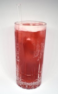 Hell alt i et longdrinkglass med isbiter og topp med bringebærøl, gjerne alkoholfritt.