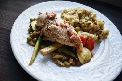 (Jeg serverte den til kyllingfilet med asparges, erter og squash, med risotto og baconterninger, deilig!)