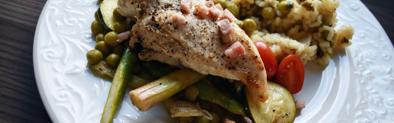 (Jeg serverte den til kyllingfilet med asparges, erter og squash, med risotto og baconterninger, deilig!)