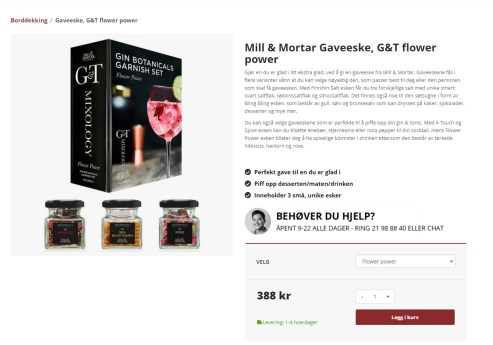 Her får du en gaveeske med forskjellige ting du kan garnitere gin&tonicen din med, den kommer i to varianter: med A Touch of Spice esken kan du tilsette enebær, stjerneanis eller rosa pepper til din cocktail, mens Flower Power esken tillater deg å ha spiselige blomster i drinken ettersom den består av tørkede hibiscus, havtorn og rose.
