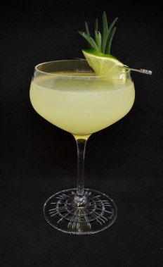 Rist alle ingrediensene med is og sil over i et fint glass og pynt med lime og rosmarin.