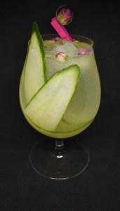 Rist dette og hell over i et glass med roseblader/små roser, agurkskiver og topp med club soda.