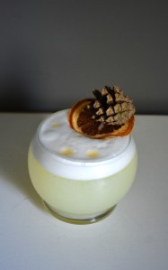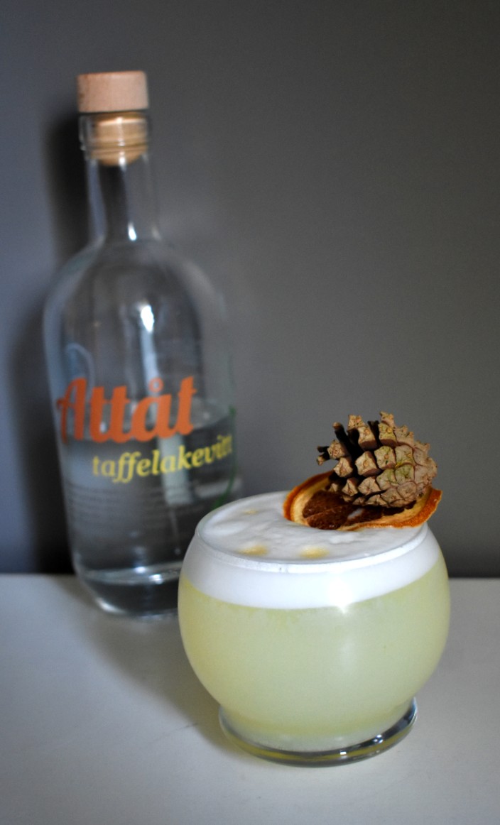 Shake alle ingrediensene først uten is, så med is. Pynt med furukongle og tørket sitrus.