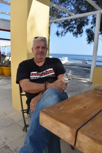 Yiannis er bare innom på øya en snartur, men tar seg heldigvis tiden til en prat og smaking, selv om datteren har tatt over produksjonen på Santorini er han veldig opptatt av å backe henne opp på alle måter.