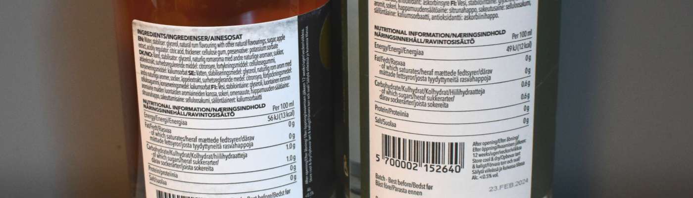 Ingredienser: Vann, glycerol, naturlige aromaer (einebær, koriander, capsicum), syre: sitron, kaliumsorbat, askorbinsyre.