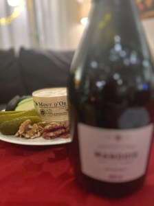 Tilbehøret har en del å si, jeg valgte nøtter, salt kjeks, spekemat og pickles. Champagnen og osten er en deilig match, vinen er lett utviklet med jordlige og nøttete hint, perfekt også til salte frøkjeks, spekemat og valnøtter. Takler også pickles. Meget godt valg om man ikke skal ha Juravin til!