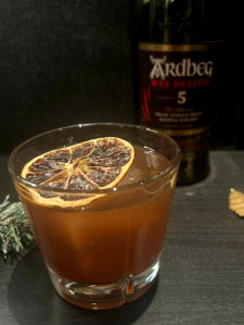 Over en stor isbit hell 6-8 cl Ardbeg, noen dæsjer sjokolade bitter og ønsket mengde stoutsirup*. Rør og pynt med dehydrert sitrus.