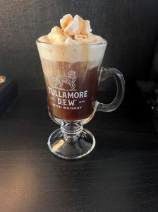 Hell Tullamore D.E.W. Original, varm kaffe og Demerara-sukker i et Irish Coffee-glass. Rist kremfløte i en shaker til den tykner før du legger den over drinken. Pynt med revet muskatnøtt og 3 kaffebønner.