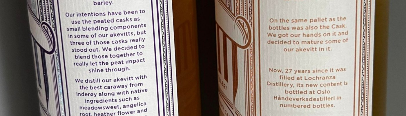 Fin nese med karve, sitrus, gule frukter, florale toner, krydder og hint av fat. Den er fruktig på smak, lett kompleks, fint preg av både akevitt og whisky, krydret og lang utgang. Interessant og artig akevitt, det beste fra begge verdener. 90p