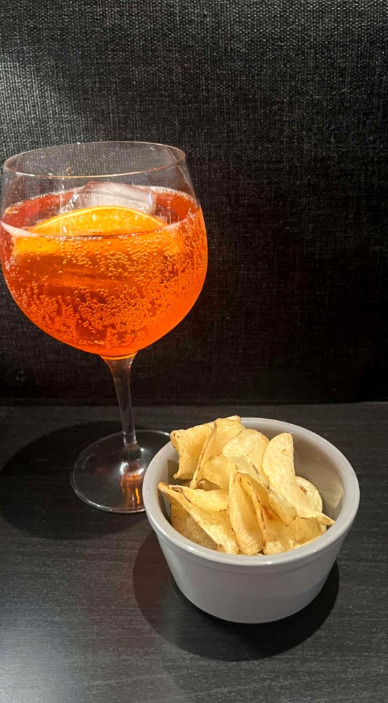 Aperol Spritz og salte chips med vinegar. Boken skriver at bitre og urtete toner i begge skal passe godt, samt vinegar. Dette blir litt terningkast 4+, det er en grei match med aperolen, men ikke perfekt. Jeg hadde nok valgt mange andre før dette potetgullet. Test det gjerne!